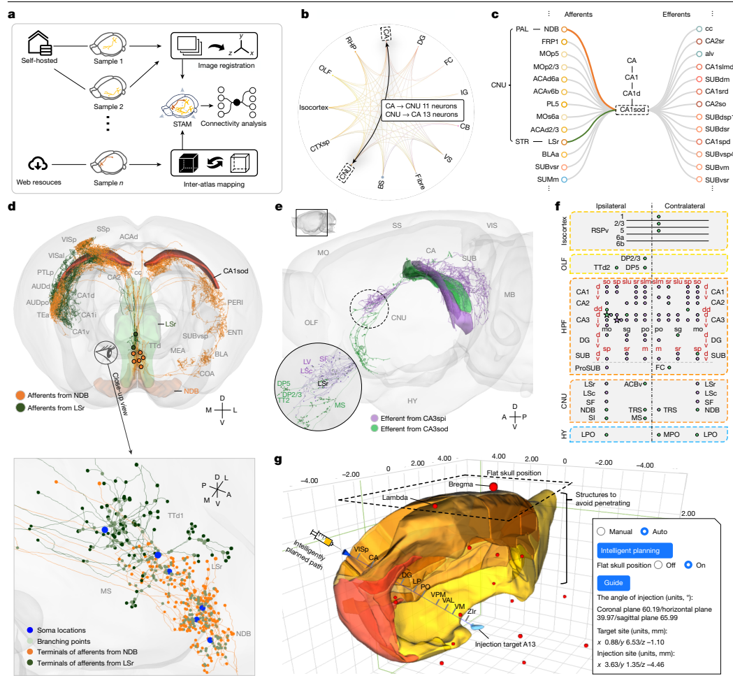 整合1,644个单神经元形态数据,分析CA3spi(海马CA3区锥体层中间域)与CA3sod(海马CA3区始层背侧域)神经元投射差异:前者主要投射至同侧和对侧海马,后者则更多投射至内侧隔核等深部结构。