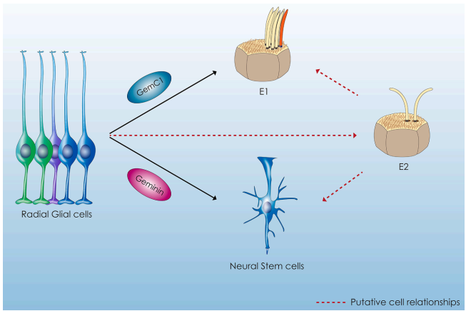 在胚胎发育过程中,放射状胶质细胞(radial glial cells)被发现能双向分化为神经干细胞(NSCs)和室管膜细胞(ECs)。通过谱系追踪技术证实,这两种细胞在胚胎第14.5-16.5天(E14.5-E16.5)期间共享共同的祖细胞来源。Geminin蛋白家族在此过程中扮演关键调控角色:GemC1促进细胞周期退出并驱动ECs分化,而Geminin则通过对称分裂维持NSCs库的稳态。这种精确的平衡机制确保了脑室区(SVZ)生态位的正常功能。