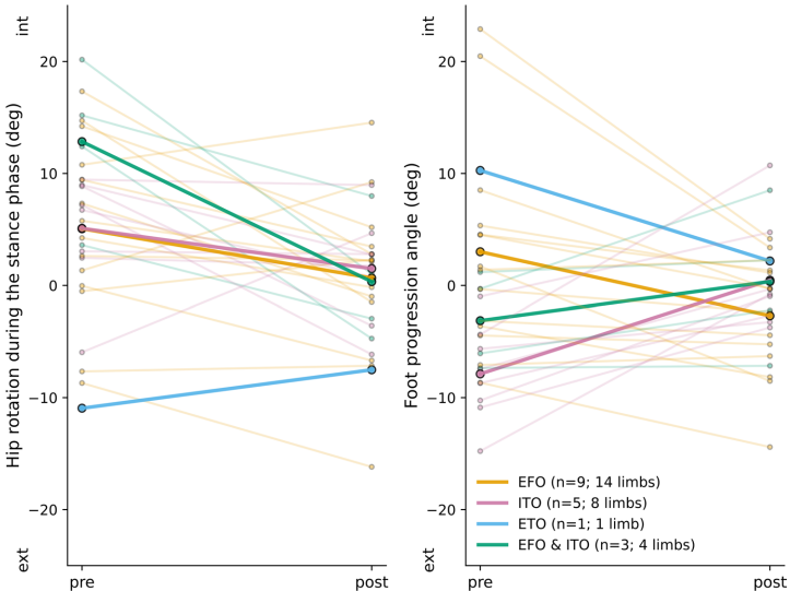 所有亚组(股骨外旋截骨EFO、胫骨内旋截骨ITO等)站立相髋旋转角与足前进角均趋近中立位(图3),但矫正幅度(5°-10°)小于术中调整值(15°-30°),提示静态对齐与动态步态存在差异。