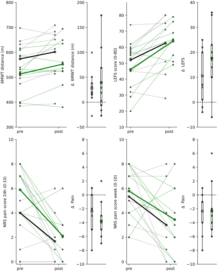 6MWT距离平均增加34米(95% CI: 9, 59;p=0.013),但改善程度存在异质性:单侧手术组增28米,双侧组增39米。5例达最小临床重要差异(MCID, 7%),4例(3例双侧)出现下降。