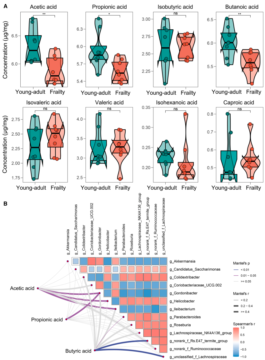 研究也存在若干局限:16S rRNA测序限制物种分辨率;雄性小鼠模型未能反映性别差异;SCFA检测未涵盖全部相关代谢物。未来研究可通过宏基因组测序解析菌株水平变异,结合无菌动物模型验证因果关联。这些发现为开发基于菌群调控的抗衰弱策略(如特定益生菌或膳食纤维干预)提供了理论依据,对促进健康老龄化具有重要转化价值。