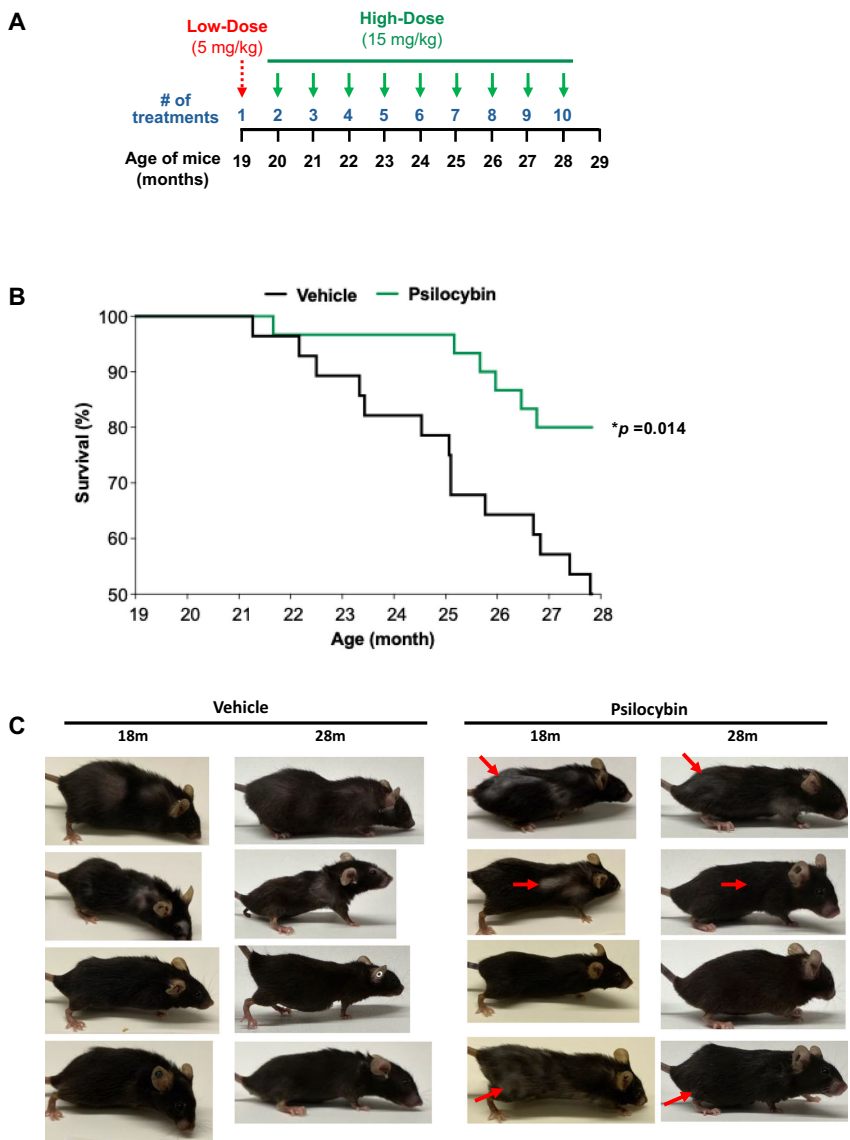 为破解这一谜题,Emory University的Louise Hecker团队在《npj Aging》发表突破性研究。研究人员首次证实:裸盖菇素的活性代谢物psilocin能使人类肺成纤维细胞(IMR-90)寿命延长29%(10μM剂量)至57%(100μM剂量),表现为累积群体倍增数增加、衰老相关β-半乳糖苷酶(β-gal)活性降低。更关键的是,老年小鼠每月接受15mg/kg裸盖菇素治疗后,生存率较对照组提升30%,且毛发质量明显改善。