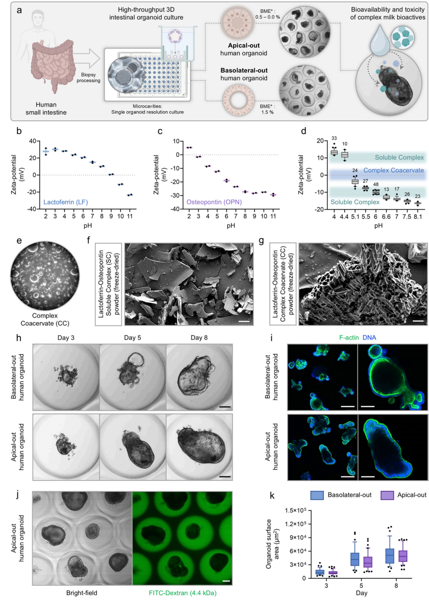 瑞士洛桑DOPPL SA公司的研究团队在《Communications Biology》发表创新成果,通过结合高通量3D肠类器官和离体结肠发酵模型,首次揭示LF-OPN复合体(包括可溶性复合物SC与相分离凝聚物CC)的双重增效机制:不仅增强肠道上皮吸收能力,还能重塑婴儿肠道菌群结构。研究采用婴儿肠道活检样本构建顶向外肠类器官(apical-out organoid),模拟营养吸收的生理方向;结合SIFR?技术(Systemic Intestinal Fermentation Research)分析6名婴儿粪便菌群的代谢响应。关键方法包括:类器官极性调控(Matrigel浓度梯度诱导基底/顶向外结构)、zeta电位分析复合物形成条件、LC-MS/MS定量蛋白吸收、GC-FID检测短链脂肪酸、以及定量浅层鸟枪测序解析菌群组成。