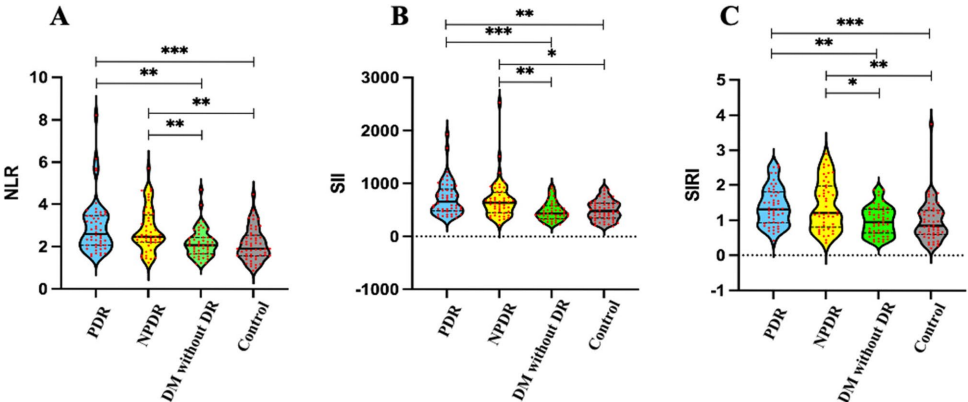 研究采用双管齐下的设计:横断面研究纳入203名受试者(含PDR、NPDR、DM无DR及对照组),纵向分析基于Beichen眼病研究(BCES)队列,追踪479名基线无DR的糖尿病患者2年。关键技术包括:1) 多中心人群队列分层;2) ROC曲线确定诊断阈值;3) 多变量逻辑回归控制混杂因素;4) 炎症指标计算(NLR=中性粒细胞/淋巴细胞,SII=血小板×中性粒细胞/淋巴细胞,SIRI=中性粒细胞×单核细胞/淋巴细胞)。