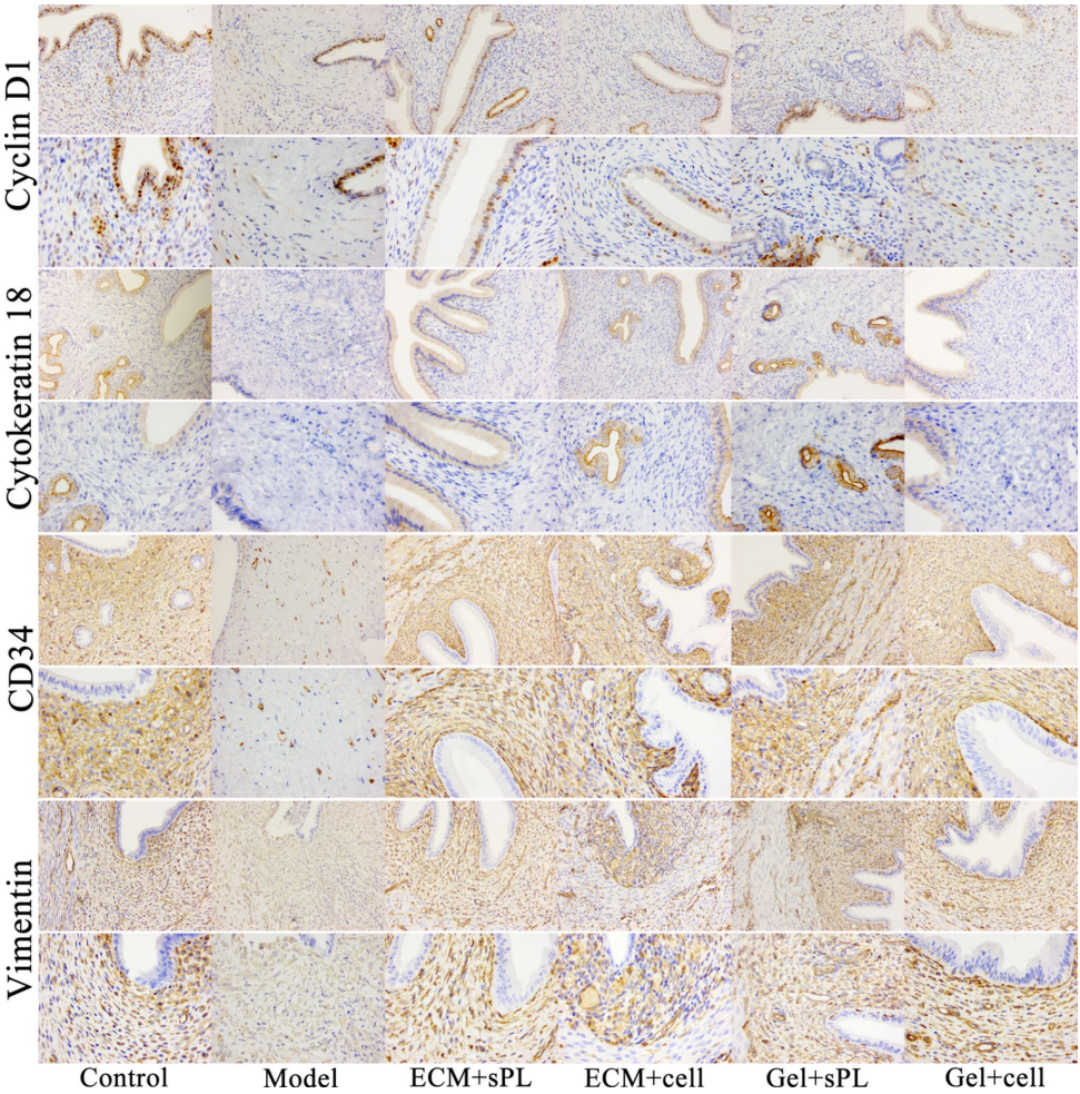 研究团队运用了四项关键技术:1) 通过心脏穿刺采集大鼠血液制备sPL的超低温冻融工艺;2) 从产妇脐带分离培养UCMSCs的三代扩增技术;3) 乙醇灌注建立薄型子宫内膜动物模型;4) 结合细胞外基质(ECM)和壳聚糖(Gel)的复合载体输送系统。实验设置包括对照组、模型组、ECM+sPL组、ECM+cell组、Gel+sPL组和Gel+cell组等多组对照,治疗周期分别为21天和42天。