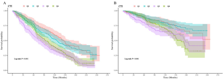 非幸存者CTI水平显著更高(8.77 vs 8.45,P<0.001),且与肾功能恶化(eGFR降低)、营养状态差(白蛋白低)及炎症加重(WBC升高)显著相关。