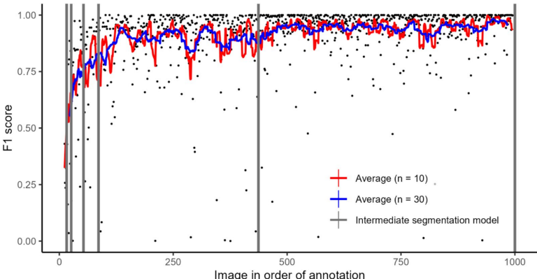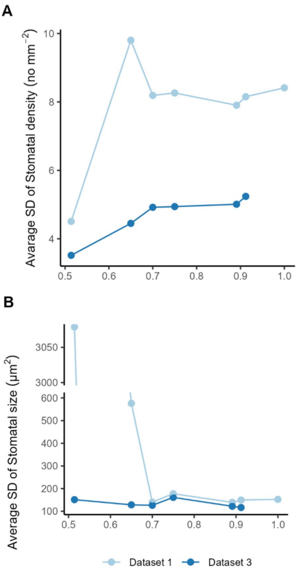 该研究的创新价值在于:技术上,将交互式机器学习引入植物表型组学,使非专家也能建立专业分析模型;方法学上,明确了模型指标与生物学显著性的量化关系(F1_10≈0.7为实用阈值);应用层面,为气孔性状的高通量筛选提供了标准化方案。特别值得关注的是,研究否定了气孔密度与大小存在强负相关的传统假设(R2<0.32),这对理解植物水分利用策略具有重要启示。正如作者强调的,相比过度优化模型精度,改进采样策略(如固定叶位)对提升统计功效更为关键——这一见解为后续植物表型研究提供了方法论指导。