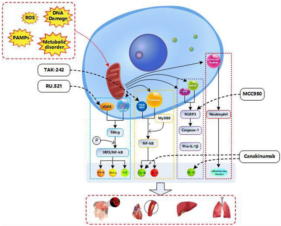 线粒体损伤释放的mtDNA/mtROS(mtDAMPs)通过cGAS-STING-NF-κB通路驱动IL-6、IL-8等SASP因子分泌。mTOR通过三重机制放大这一过程: