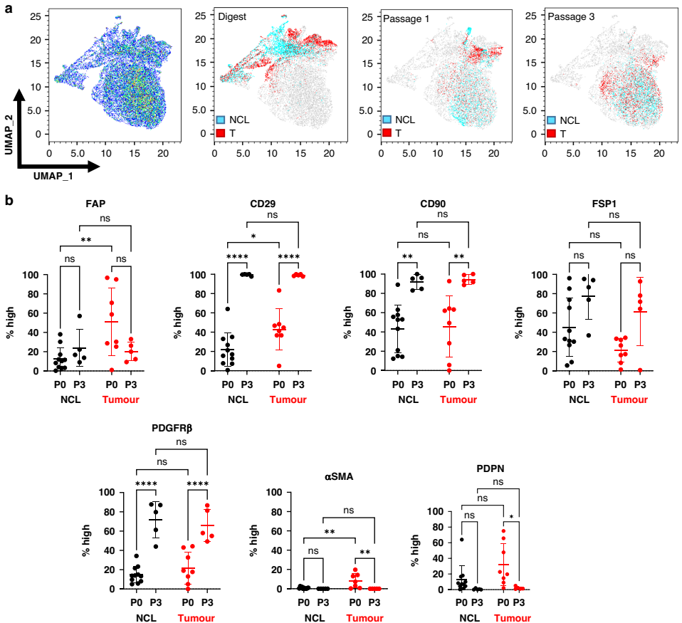 爱丁堡大学(University of Edinburgh)的研究团队在《BJC Reports》发表了一项揭示性研究。他们通过追踪11例NSCLC患者配对的肿瘤和癌旁组织来源成纤维细胞,首次系统描绘了常规培养条件下CAFs的"变形记"。令人惊讶的是,原本在体内泾渭分明的五种CAF亚型(CAF S1-S5),在培养至第3代时竟有80%以上统一"换装"为CAF-S3表型,这种表达FAPLowCD29MedαSMANeg-Low的温和激活状态,与癌旁组织成纤维细胞的特征惊人相似。