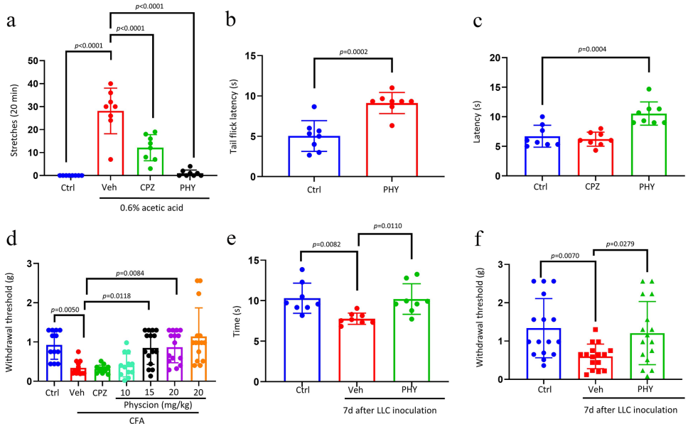 慢性疼痛治疗受限于非甾体抗炎药(NSAIDs)和阿片类药物的副作用。南方科技大学团队通过虚拟筛选从天然产物库中鉴定出大黄素甲醚(Physcion)作为新型TRPV1抑制剂,证实其通过抑制钙离子内流、下调NF-κB/MAPK信号通路,显著缓解醋酸扭体、热板测试、CFA炎症痛和骨癌痛模型中的疼痛行为,且不引起体温异常。该研究为开发非成瘾性镇痛药物提供了新候选分子。