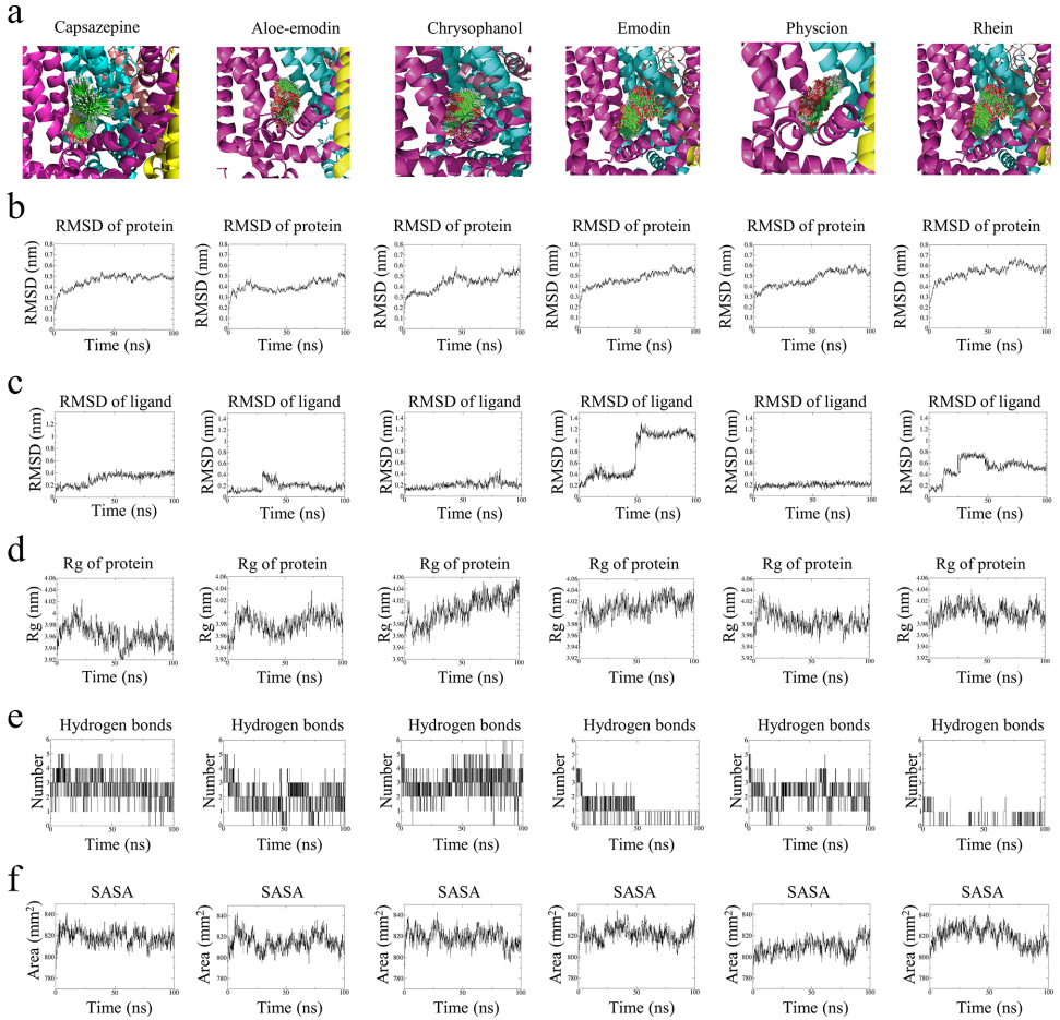 通过TRPV1抑制剂囊袋(PDB:5IS0)筛选出大黄素甲醚等5个高亲和力化合物。100 ns分子动力学模拟显示,大黄素甲醚-TRPV1复合物具有最低结合自由能(-90.864 kJ/mol),RMSD值稳定(图2b-c),氢键数量(2.225)和溶剂可及表面积(809.04 nm2)表明结合紧密。其与关键抑制残基ARG557/THR550/TYR511的结合概率达95%/64.5%/58%(图3d),结合模式经AlphaFold3交叉验证(图S1)。