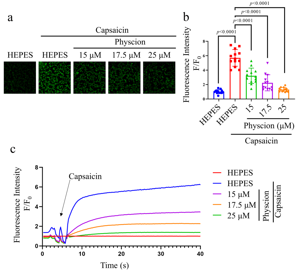大黄素甲醚(15–25 μM)剂量依赖性抑制HEK293-hTRPV1细胞中辣椒素(1 μM)诱导的Ca2+内流(图4b-c),验证其TRPV1通道阻断活性。