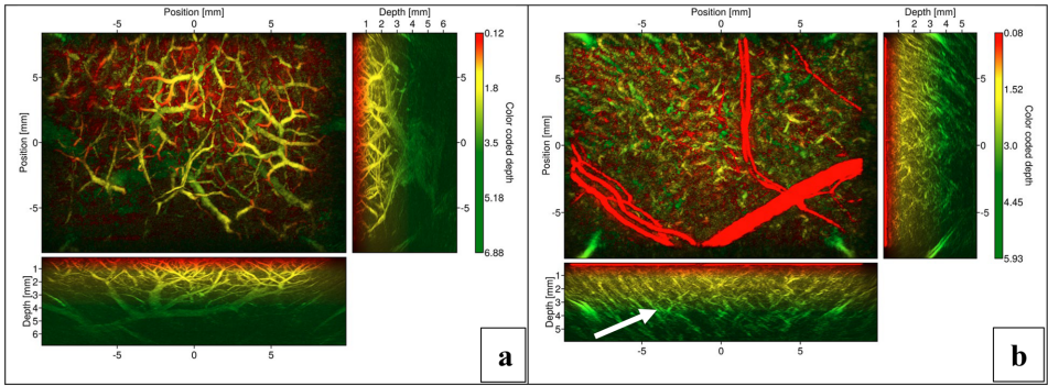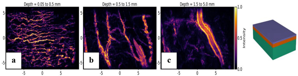 【空心器官成像】通过胃壁分层成像揭示:0.05-0.5mm浅层呈现网状微血管,0.5-1.5mm中层出现分支血管,1.5-5mm深层可见动脉-静脉并行结构。结肠成像中甚至可辨识肠腔内容物,证实系统对多层血管网络的分辨能力。