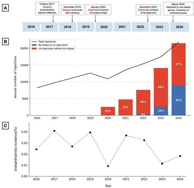 研究团队采用电子病历系统回溯分析了2016-2024年间12,044只眼(9,517例患者)的120,878次注射数据。通过对比不同操作方案下的眼内炎发生率,结合废弃物重量测算模型,评估了技术改良的安全性与环境效益。主要技术方法包括:1)基于医院信息系统的全样本队列分析;2)多参数安全性评估(眼内炎诊断严格参照国际标准);3)医疗废弃物成分的量化分析模型。