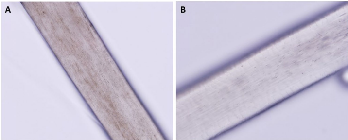 基因检测发现 homozygous HPS1 c.70G>T突变,预计产生截短蛋白(p.Glu24Ter)。毛发显微观察显示供体毛发色素颗粒数量与颜色显著减少(图2B),证实其为不完全性眼皮肤白化病(OCA)。