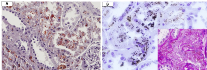 这项研究首次系统阐释了HPS相关肾脏黑变病的病理机制:HPS1突变导致黑色素体(melanosome)等LRO发育异常,使黑色素无法正常储存于皮肤,而以水溶性小分子形式进入循环,经肾小球滤过后被近端小管摄取。由于溶酶体功能缺陷,黑色素不能被有效降解,最终在肾脏异常蓄积。