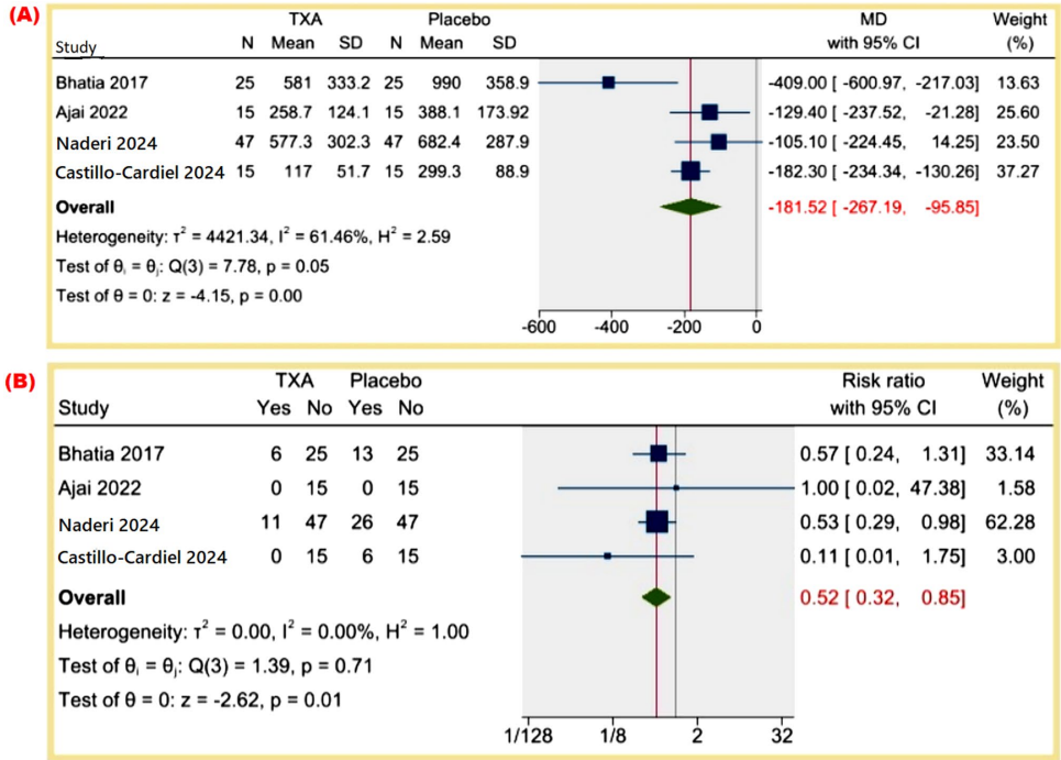 TXA组术中失血量显著减少(平均差:-181.52 mL, 95% CI:-267.19至-95.85),输血需求降低48%(RR:0.52)。