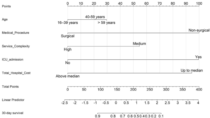针对这一临床痛点,巴西马托格罗索联邦大学公共卫生研究所的研究团队开展了一项创新性研究。他们利用巴西统一卫生系统(SUS)医院信息系统(SIH)2011-2023年的3493例宫颈癌住院患者数据,开发了首个针对该地区的30天生存预测列线图。这项发表在《Discover Oncology》的研究,通过量化评估医疗程序类型、ICU需求等关键因素,为临床医生提供了直观的决策支持工具。