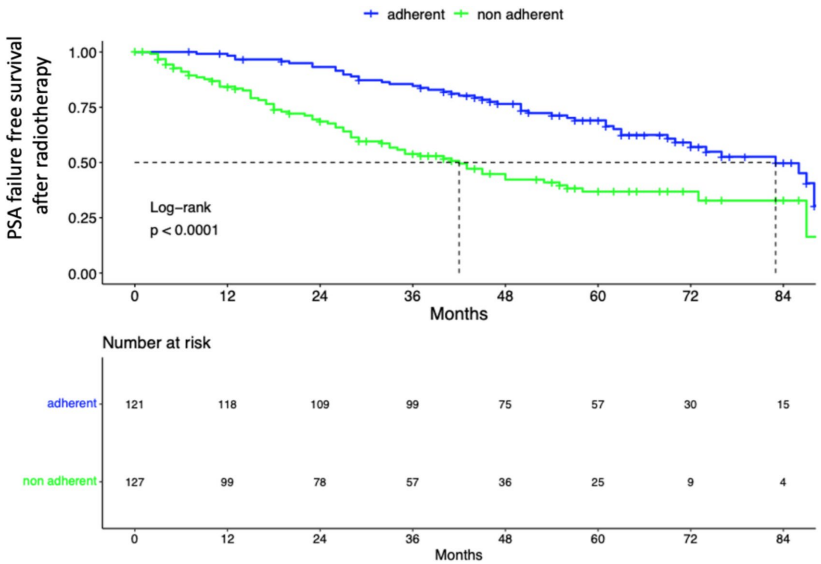 为破解这一难题,德累斯顿工业大学卡尔·古斯塔夫·卡鲁斯大学医院(University Hospital Carl Gustav Carus, TUD Dresden University of Technology)的研究团队开展了一项回顾性队列研究。他们纳入2012-2016年间802例RP术后存在高危病理特征(≥pT3、R1或pN1)且接受MDT建议的患者,排除随访<3年者。通过多变量逻辑回归分析依从性预测因子,采用Kaplan-Meier曲线和log-rank检验比较生化复发(BCR)、PSA失败时间、癌症特异性生存(CSS)及总生存(OS)差异。