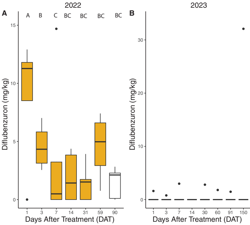 在"实验1:牛粪中抗寄生虫药物暴露特征"部分,研究人员发现二氟脲在2022年的粪便中持续检出长达90天,最高浓度达11.57 mg/kg;依普菌素在30天内保持可检测水平,峰值浓度为11.61 mg/kg;而芬苯达唑仅在处理后3天内检出,最高浓度为38.89 mg/kg。这些数据揭示了不同药物在牲畜体内的代谢排泄特征。