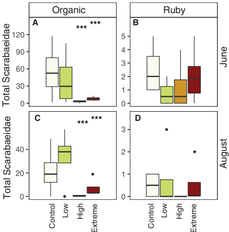 研究结论部分明确指出,长期排泄的二氟脲(Clarify产品)和依普菌素(LongRange产品)对粪甲虫群落构成显著威胁,而芬苯达唑(Safe-guard产品)则表现出较好的环境友好性。这一发现具有重要的实践指导意义:对于重视粪甲虫生态功能的牧场主,应避免使用排泄周期长的依普菌素和二氟脲产品,而芬苯达唑则可以作为更安全的选择。