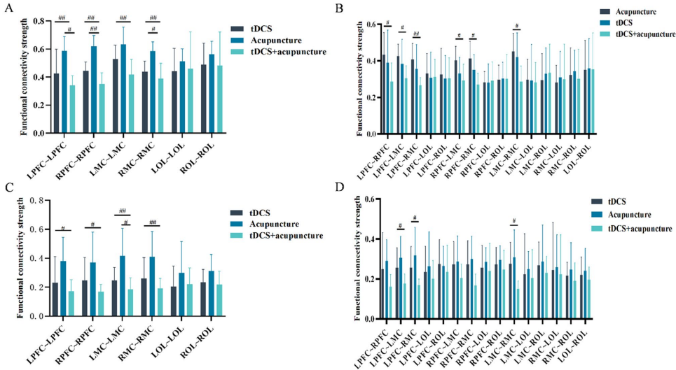 研究采用三项核心技术:1) 随机对照试验设计(n=60),将患者分为tDCS组、针灸组和联合组;2) 基于国际10-20系统的tDCS干预(阳极置于M1区,2mA/20min);3) fNIRS多通道检测技术,分析LPFC(左前额叶)、RPFC(右前额叶)等脑区HbO2/HbR功能连接强度。所有患者均接受标准化康复治疗作为基础干预。