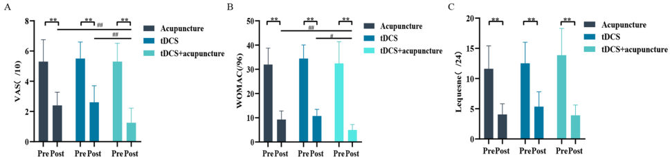 临床疗效比较:联合组VAS评分降低幅度显著优于单疗法组(P<0.01),WOMAC评分改善更显著(P=0.004),证实协同效应。如图2所示,联合组治疗后VAS降幅达63%,而tDCS和针灸组分别为45%和38%。