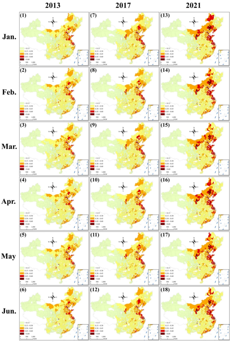 【时空特征】2013-2021年县级排放时空演变显示(图3-4),高排放区主要分布在东部沿海城市群,且呈现明显的季节波动特征。通过分城乡类型的连续性校正,成功捕捉到部分区域排放下降趋势,这是传统"逐年递增"校正方法无法实现的。
