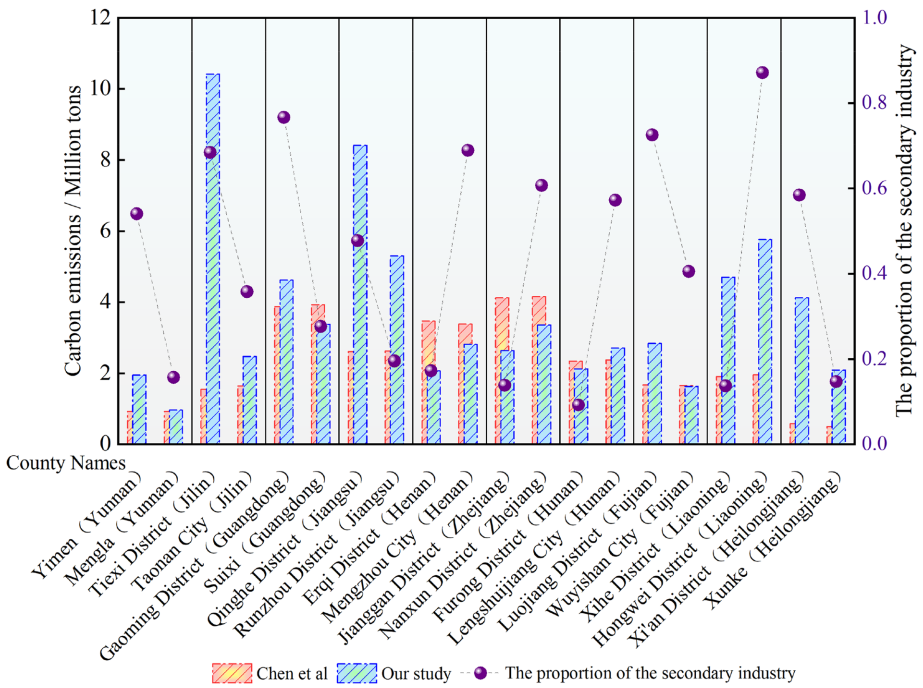 【技术验证】与传统方法相比,新构建的工具变量与GDP的相关系数R2稳定在0.8左右(图5),且测试集RMSE(0.06)显著低于Chen等报道的0.13。典型案例显示,相同省份内工业结构差异显著的县区,在新数据集中被正确区分,而传统方法则产生系统性偏差(图6)。