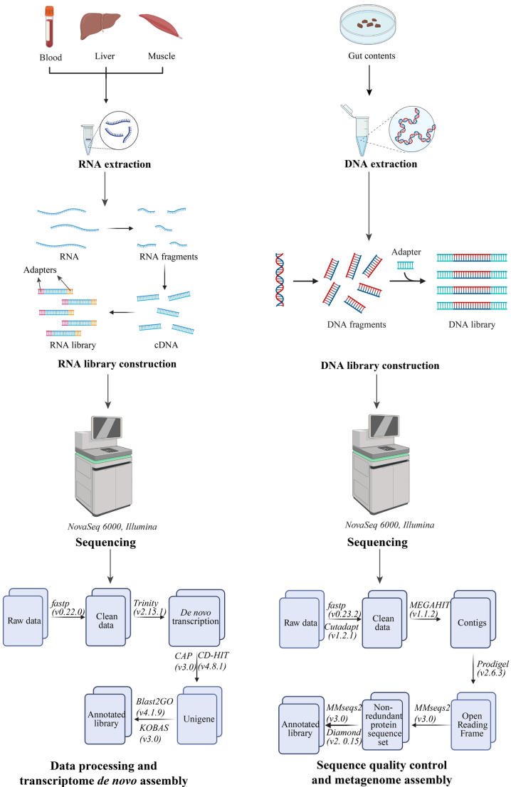 样本特征与数据质量:20个个体形态数据完整记录(体重3.54-21.53g),获得570,192条转录本(N50=1289bp)和294,962个unigenes,宏基因组检测到Firmicutes(厚壁菌门)、Proteobacteria(变形菌门)等5大优势菌群。