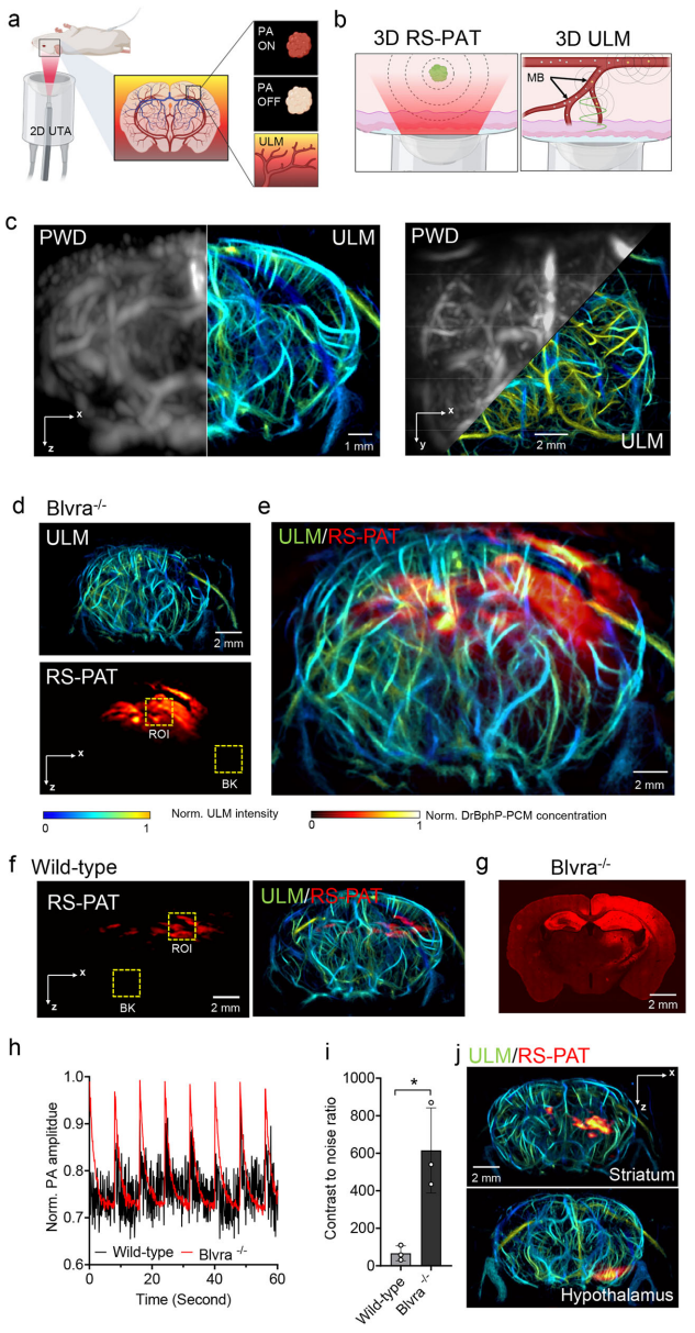 结论:通过3D-PAULM系统(图2a),首次在完整头骨下对海马区(深度2-3 mm)DrBphP-PCM标记神经元成像,信噪比(CNR)达615(Blvra-/- vs. WT:9.2倍提升)。下丘脑(深度6-7 mm)神经元清晰可见(图2j),突破传统光学成像深度极限(1-2 mm)。