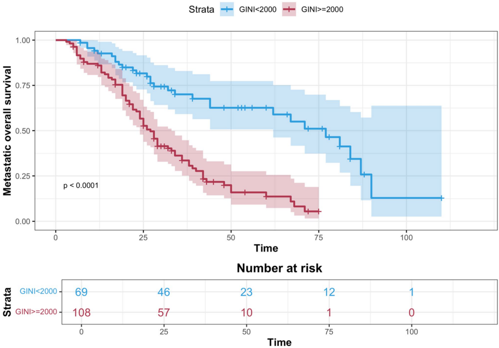 研究纳入118例男性(66.7%)和59例女性(33.3%),中位年龄63岁。肿瘤原发部位以左半结肠为主(83.1%),肝转移最常见(65.5%)。97例接受FOLFIRI方案化疗,80例接受奥沙利铂为基础的治疗。根据GINI分组,≥2000组108例,<2000组69例。