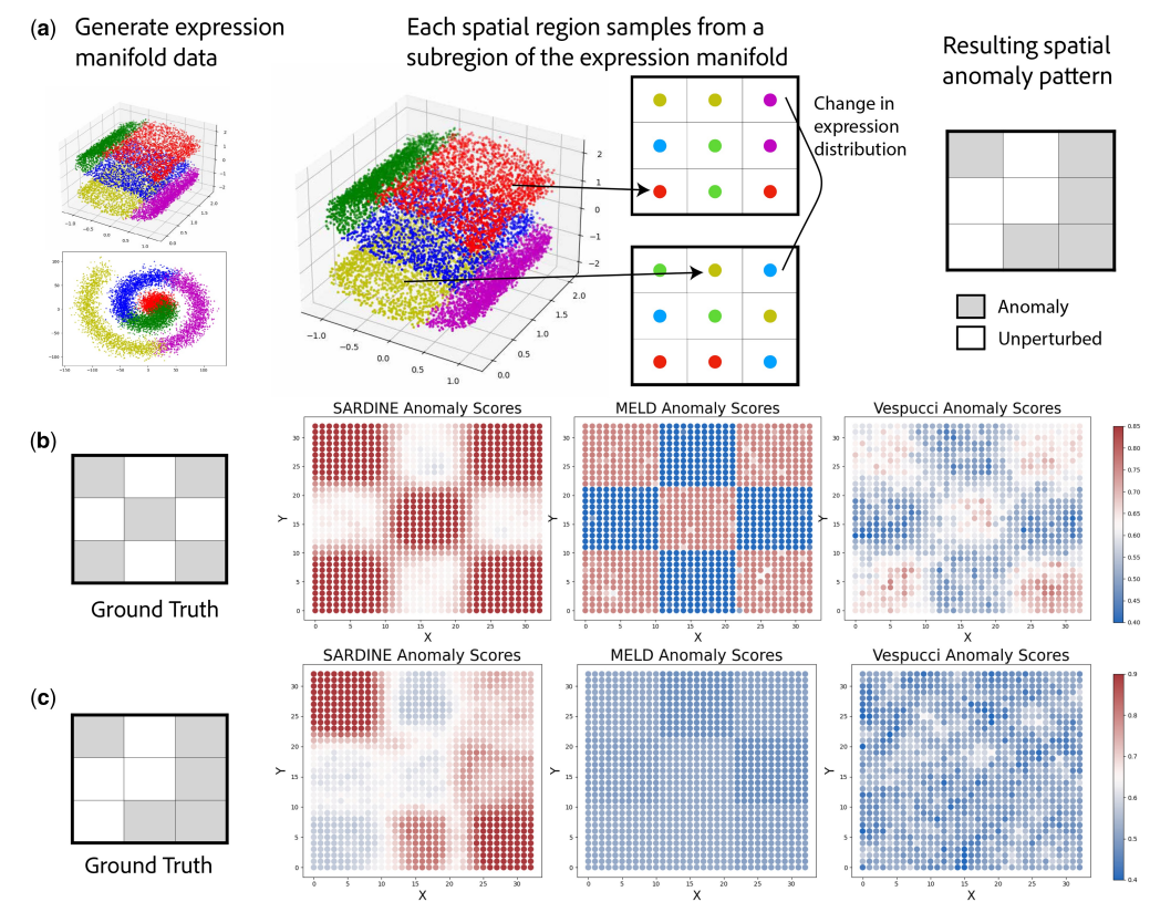通过设计"棋盘格"和"螺旋"空间异常模式,比较Sardine与MELD、Vespucci在AUROC和均方误差(MSE)上的表现。在100维特征的多变量正态分布模拟中,Sardine达到完美AUROC(1.0)和最低MSE(0.022),显著优于Vespucci(MSE=0.081)。在S曲线流形数据中,Sardine保持0.984的AUROC,而对比方法均低于0.5,证明其处理非线性流形的优势。
