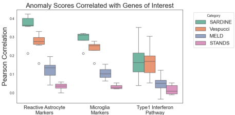在皮层穿刺伤模型中,Sardine准确锁定损伤区域(坐标空间左下角),其异常评分与反应性星形胶质细胞标志物(Pearson r=0.42)和小胶质细胞标志物(r=0.38)显著相关。基因集富集分析(GSEA)检出650个显著通路(FDR<0.05),包括"异常先天免疫"(FDR=2.2×10-16)等损伤相关表型,远超Vespucci(26个)和MELD(0个)。Moran's I指数(0.883)证实其空间连贯性最优。