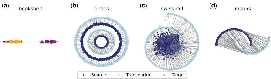 研究结果部分显示,在"3.1 W1 OT solver learns the monotonic map on 2D datasets"中,通过设计的"书架"和"同心圆"等合成数据集验证,该方法能保持标记点的相对顺序,成功学习到符合生物学意义的"单调"映射。