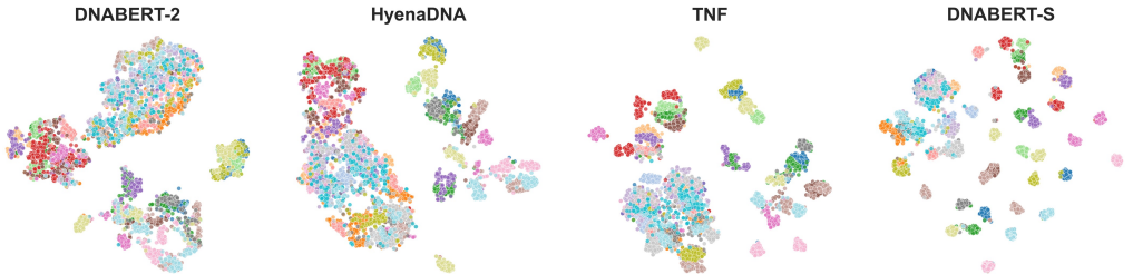 DNABERT-S创新性地在神经网络中间层实施序列特征混合:随机选择隐藏层将不同DNA序列的表示向量按Beta分布权重混合,迫使模型识别混合比例并区分物种特征。这种"特征鸡尾酒"式训练使嵌入空间形成清晰的物种边界,如图1所示: