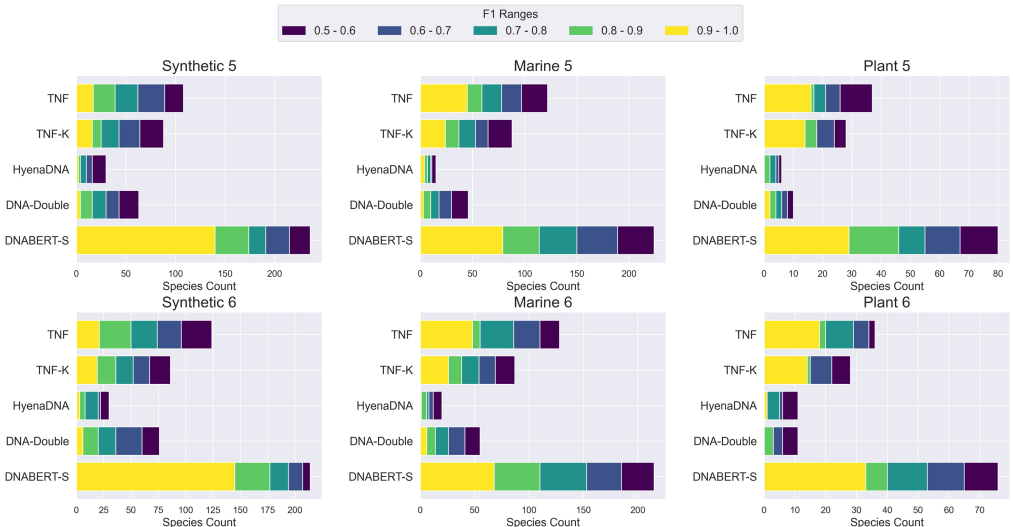 在聚类任务中,DNABERT-S以53.8的平均ARI指数碾压所有基线(表1),较最优传统方法TNF-K(26.3)实现100%提升。在更具挑战性的宏基因组分箱任务中(图3),模型从海洋和植物样本中识别出的高精度(F1>0.5)物种数量是基线的两倍: