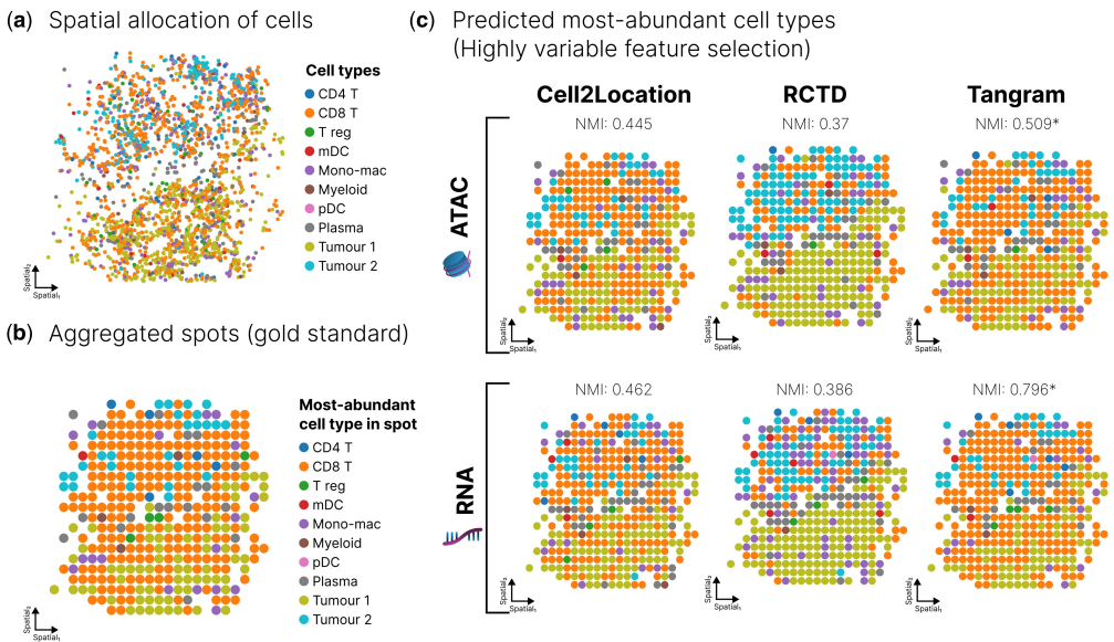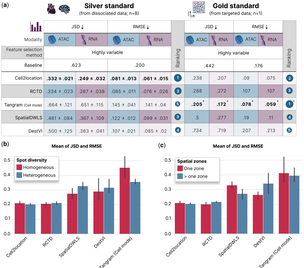 来自德国慕尼黑工业大学(Technical University of Munich)和亥姆霍兹慕尼黑研究中心(Helmholtz Center Munich)的Sarah Ouologuem、Laura D. Martens等研究人员在《Bioinformatics》发表重要研究,系统评估了五种空间转录组解卷积方法在染色质可及性数据中的适用性。研究团队创新性地开发了双模态模拟框架,通过人类心脏和大脑单细胞多组学数据(银标准)以及黑色素瘤空间多组学数据(金标准),生成配对的转录组和ATAC-seq空间数据。研究重点评估了Cell2location、RCTD、Tangram、SpatialDWLS和DestVI五种算法,采用高度可变/高度可及性两种特征选择策略,通过RMSE和JSD等指标全面比较性能差异。