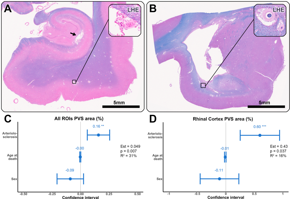 研究团队运用多项关键技术:1)基于Aiforia平台的卷积神经网络(CNN)实现Aβ斑块、CAA、tau缠结和pTDP-43包涵体的自动定量;2)半自动化的血管周围间隙(PVS)面积测量技术;3)线性混合效应模型(LME)进行多因素统计分析。样本来自麻省阿尔茨海默病研究中心(MADRC)尸检队列,涵盖从Braak 0期到VI期的完整疾病谱系。