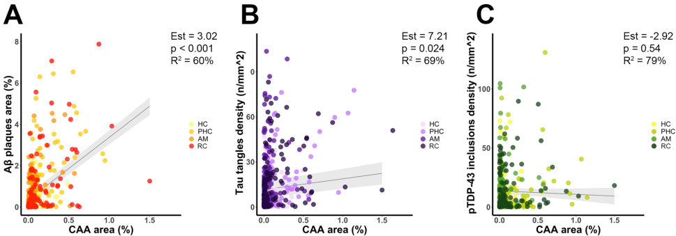 线性混合效应模型揭示,CAA面积与Aβ斑块百分比面积呈强正相关(Est.=3.02,p<0.001),与tau缠结密度也显著相关(Est.=7.21,p=0.024)。这种关联独立于Braak分期存在,在嗅皮质和后海马旁皮质尤为显著。