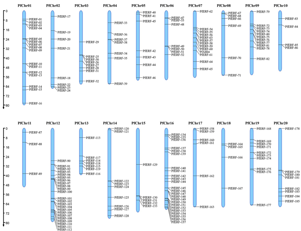 PfERF家族鉴定与特征分析:从紫苏基因组鉴定出186个含单个AP2结构域的ERF成员,分为ERF(68)和DREB(118)两大分支。基因结构分析显示80.11%成员不含内含子,15个保守基序中基序1、2、4、5普遍存在。染色体定位显示成员随机分布于20条染色体,16号染色体分布最多(24个)。