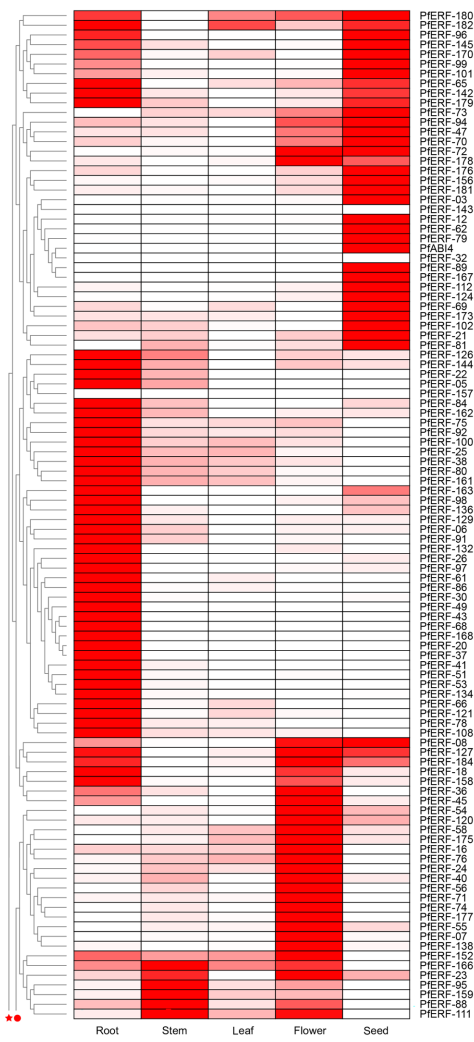 系统进化与多序列比对:292个ERF蛋白(含拟南芥106个)聚类显示,PfABI4与拟南芥AtABI4(AT2G40220.1)亲缘最近,同属A3亚组。多重序列比对揭示五个保守区域:PEST序列、AP2关联基序、S/T区域、LRP基序和AP2结构域。