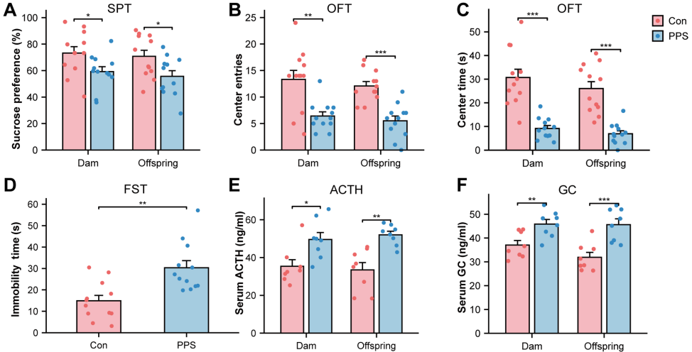 PPS母鼠及子代均表现出典型抑郁样行为:蔗糖偏好降低41%(SPT)、中心区域探索时间减少(OFT)、不动时间延长(FST),伴随血清糖皮质激素(GC)和促肾上腺皮质激素(ACTH)水平显著升高(P<0.05),证实HPA轴过度激活。