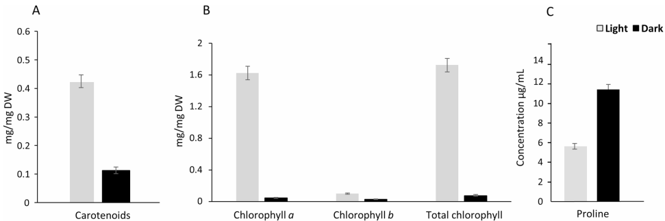 显微镜观察显示,黑暗培养导致细胞运动能力显著下降,并伴随叶绿体退化。分光光度数据证实,黑暗组叶绿素a/b比值异常升高至16.6(正常约3),总类胡萝卜素含量下降3.8倍,这些变化与光合器官功能抑制直接相关。