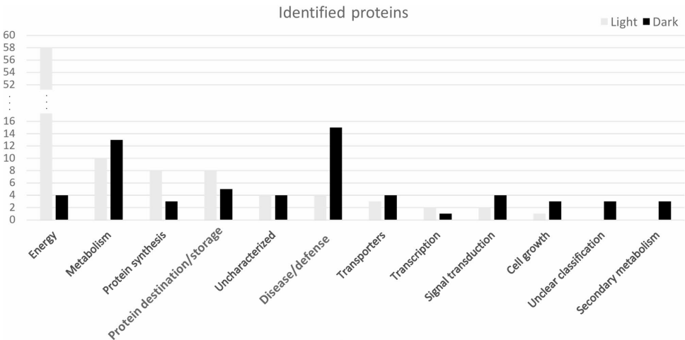 应激响应蛋白中,3种谷胱甘肽-S-转移酶(GST)和2种Hsp70分子伴侣显著上调。特别值得注意的是,过氧化物还原酶(Peroxiredoxin)的双向调节——一种亚型在黑暗组积累,另一种在光照组富集,反映了光暗条件对氧化还原平衡的不同需求。