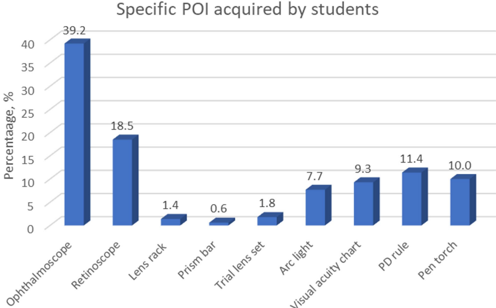 样本特征:39.8%的学生拥有至少一种POI,其中ophthalmoscope(39.2%)和retinoscope(18.5%)最常见。临床年级学生持有率显著高于非临床年级(53.4% vs 46.6%, p=0.009)。