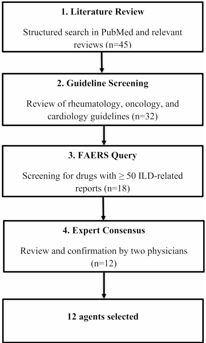研究采用四步法筛选目标药物:文献初筛→监管标签复核→FAERS信号检测→临床相关性过滤。主要运用药物警戒学中的不成比例分析方法,通过构建2×2列联表计算ROR及其95%置信区间,比较各药物ILD报告频率与背景值的差异。所有统计分析均采用VassarStats和Excel完成。