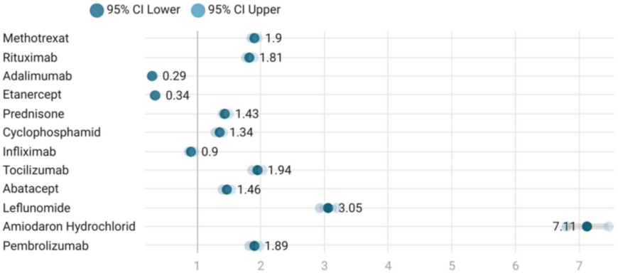 胺碘酮以9.4%的ILD报告比例高居榜首,其ROR达7.11(95%CI:6.79-7.45),显示极强的信号强度。来氟米特(4.3%,ROR=3.05)和托珠单抗(2.8%,ROR=1.94)分列二三位。