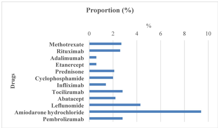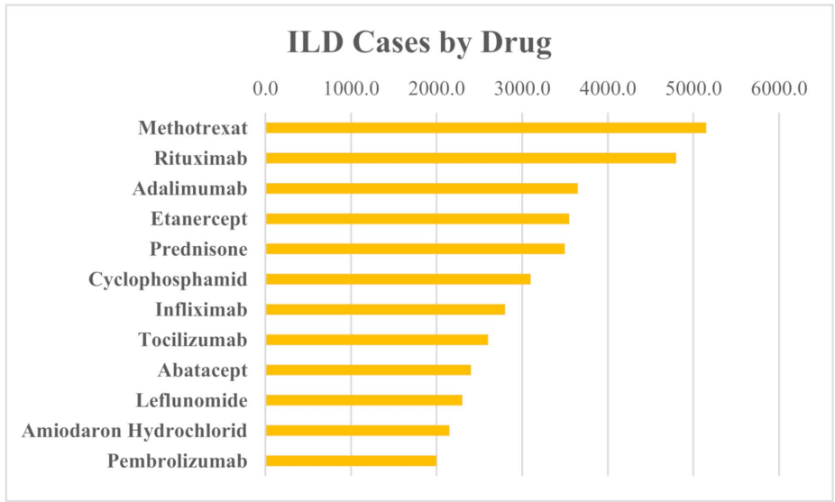 甲氨蝶呤(5,132例)和利妥昔单抗(4,778例)的ILD报告数最高,反映了其广泛临床应用。而胺碘酮虽总报告量较少(22,410例),但ILD占比惊人。