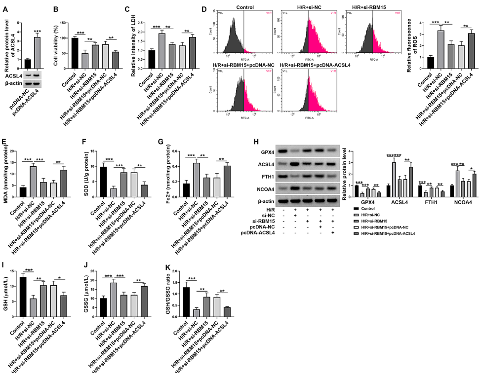 最后,"Overexpression of ACSL4 restored the effect of RBM15 knockdown"证明ACSL4过表达可逆转RBM15沉默对H/R损伤的保护作用,验证了RBM15/ACSL4轴的调控关系。